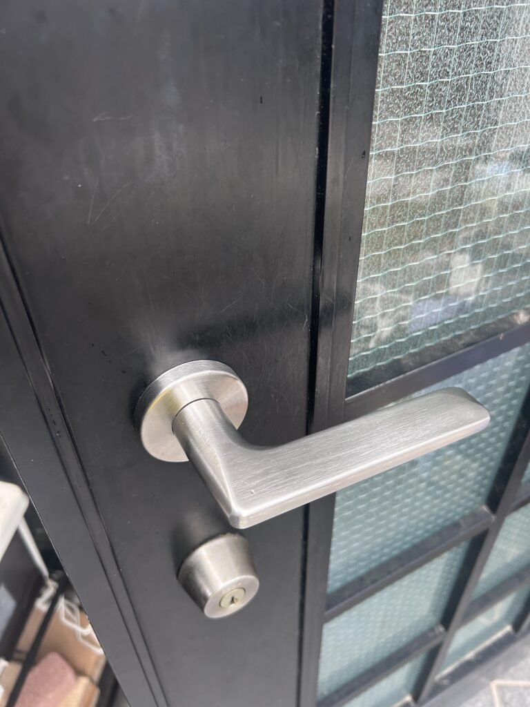 玄関のレバーハンドル内部部品が破損し、触るたびに大きくガタつく状態でした。